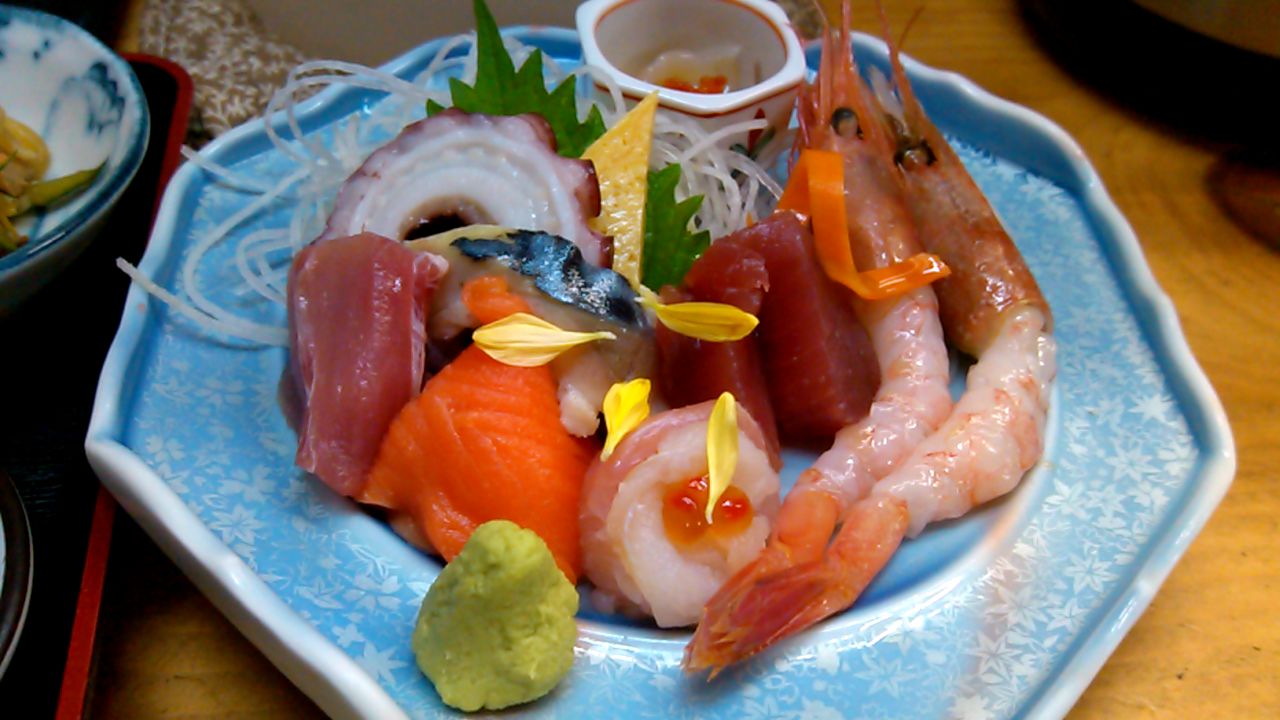 鮭はらす焼と刺身だけど、上記の画像のように小鉢が付いてくるので、テーブルが料理だらけに・・・