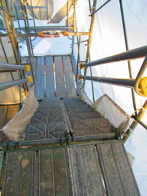 とりあえず、像の横にたどり着くためには、こんな足場を登らないといけませんが、隙間が多くて、キシキシいう音がなんとも言えません。